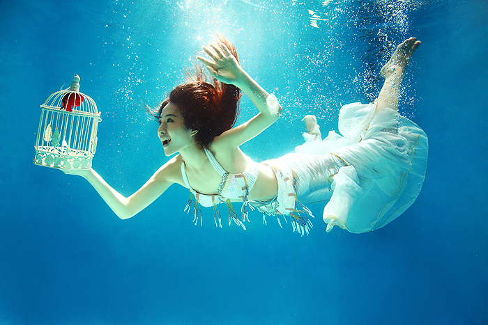 直接光指我们平常所说的强光或硬光 ,如太阳光的直射,现场聚光灯的照射等。厦门水下婚纱照小编觉得这类光线照射在人物身上,会产生很大的反差,有利于对人物性格的刻划,在情感塑造上有很大的好处,但它不利于对人物作一种细腻的情态描绘,也就是说在形象塑造上弊大于利,但一切都要由现场被摄人物的情况来定。