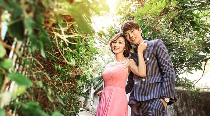 我们可以用一个最常见的pose,就是新娘站在前面新郎稍微向后靠,然后踮起脚尖,这种姿势是很绅士的一种姿势,看上去也不会是那么的呆板,所有新郎都可以使用这种姿势。
