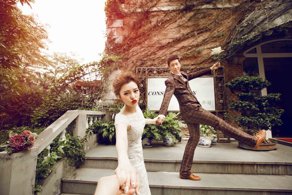 新郎新娘一高一低,让婚纱照的人物布局更加有层次感,站法即使多变也需要合适的礼服来搭配,这直接决定了婚照出来的效果是俏皮活泼还是庄重唯美。