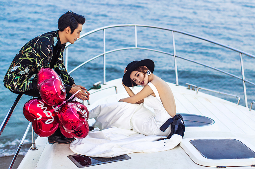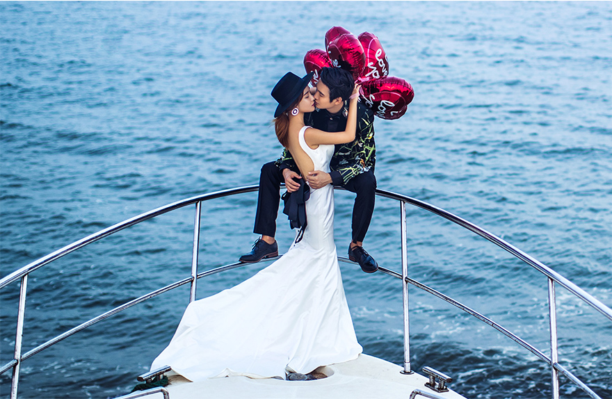 因为在大海边不像在厦门婚纱摄影内景之内,如果有什么创意,还可以在影楼内取舍,但是在海边拍摄的话,则不会这么方便了,所以为了不让自己的姿势或者动作显得单调的话,那么就带上自己喜欢的小道具,饰品、玩具皆可,这样也能为婚纱照锦上添花。